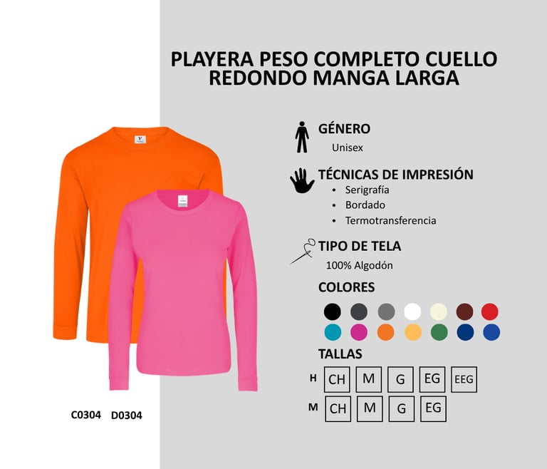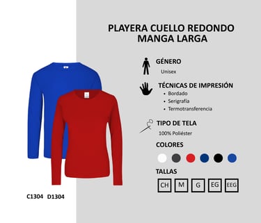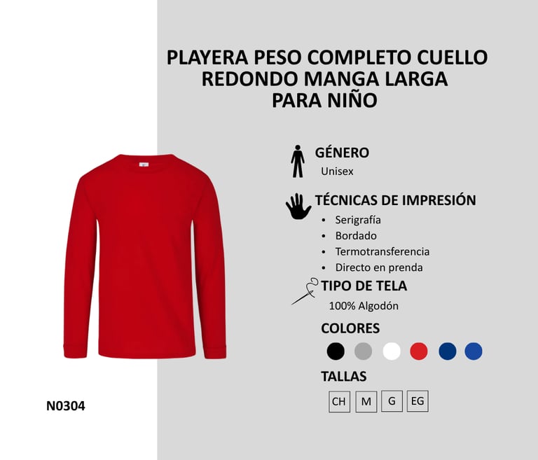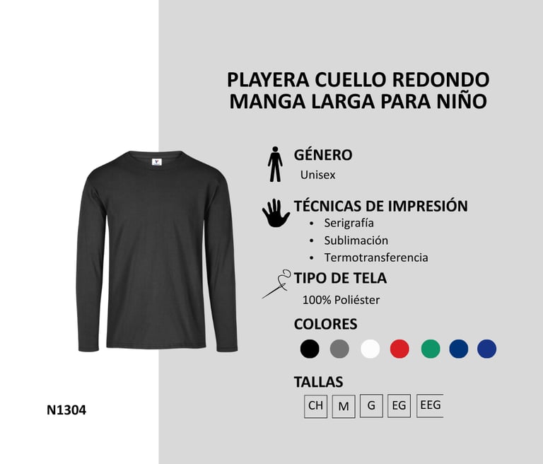 Playera Cuello Redondo Manga Larga para Niños 150 gr/m2 Mesh · 100 % Poliéster · CH(4A)-EEG(16A)