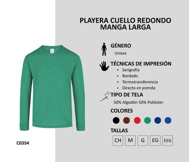 Playera Cuello Redondo Manga Larga para Caballero 150 gr/m2