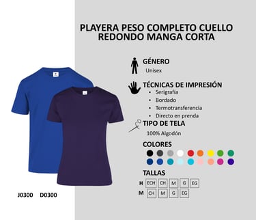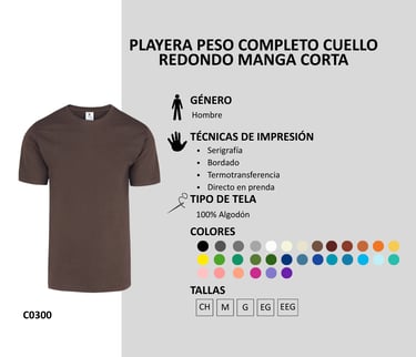 Playera Peso Completo Cuello Redondo Manga Corta para Caballero 195 gr/m2